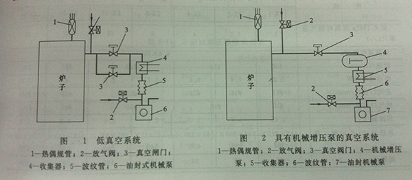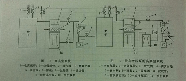 真空燒結爐,一般預抽真空爐采用的是這個系統(tǒng)。圖二是具有機械增壓泵的真空系統(tǒng),真空度在1.33-3*10﹣¹pa,使用此真空系統(tǒng)的一般是真空淬火爐。圖三和圖四是高真空系統(tǒng)和帶有增壓泵的高真空系統(tǒng),一般適用于真空度在1.3*10﹣²-6.6*10﹣4pa范圍內(nèi)的真空熱處理爐,
